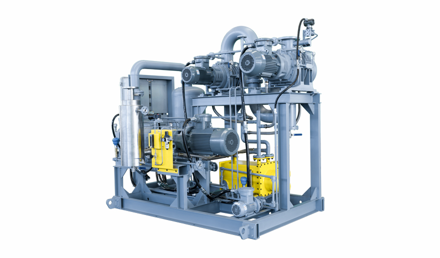 沃爾姆技術團隊通過現(xiàn)場測試發(fā)現(xiàn),液環(huán)泵工作液(自來水)在 38℃時汽化壓力達 6610Pa,主羅茨泵吸排氣壓差達到10kPa,導致羅茨泵無法啟動。綜合考慮客戶對于節(jié)能增產(chǎn)的需求,于是制定方案將液環(huán)羅茨機組升級為螺桿羅茨機組(DMY600羅茨泵 +DMY300羅茨泵+ ESDP900螺桿泵),機組不再受夏季溫度影響,能夠全年高效工作。